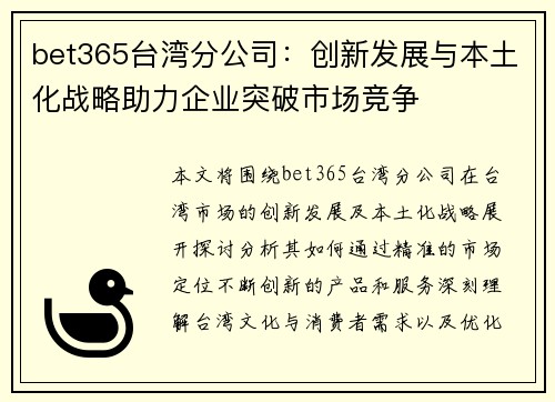 本文将围绕bet365台湾分公司在台湾市场的创新发展及本土化战略展开探讨,分析其如何通过精准的市场定位、不断创新的产品和服务、深刻理解台湾文化与消费者需求、以及优化运营模式等多维度措施,成功突破市场竞争,获得商业突破。在全球在线博彩行业竞争日益激烈的背景下,bet365凭借其灵活的战略和强大的创新能力,已经在台湾市场取得了显著的成绩,成为行业的重要参与者。本文将深入探讨bet365台湾分公司如何通过创新与本土化战略,获得竞争优势,并为其他跨国公司在本地化经营过程中提供宝贵的经验。